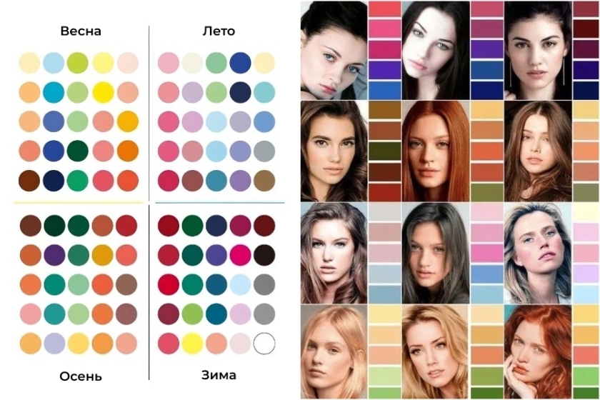 Подбор цветов по цветотипу основан на гармонии с природным оттенком кожи, волос и глаз. Холодные типы («Зима», «Лето») гармонируют с холодными оттенками, а теплые («Весна», «Осень») — с теплыми. • Зима: яркие, контрастные, холодные цвета (черный, белый, темно-синий, вишневый, фуксия). • Лето: приглушенные, прохладные, пастельные тона (пепельно-голубой, жемчужный, фисташковый, сиреневый). • Весна: теплые, свежие, солнечные оттенки (лососевый, персиковый, золотистый, аквамарин). • Осень: насыщенные, теплые, землистые тона (оливковый, коричневый, верблюжий, хвойный).