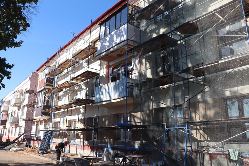 Согласно проекту, выполняются следующие виды работ: ремонт участков кирпичной кладки наружных стен, замена отмостки, чердачного утеплителя, устройство гидроизоляции, выравнивание, оштукатуривание, установка оконных блоков в местах общего пользования и др. Еще предстоит заменить тамбурные двери, козырьки над входами в подъезды, отремонтировать крыльца, уложить утеплитель на чердак отдельных подъездов.