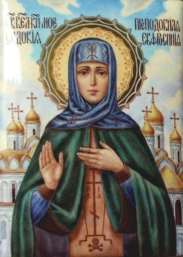 Преподобная Евфросиния, в миру Евдокия, дочь Суздальского князя Димитрия Константиновича была с 1367 года супругой Великого князя Московского Димитрия Донского. Святая княгиня была строительницей храмов. В 1387 году она основала в Московском Кремле Вознесенский женский монастырь. В 1395 году, при нашествии Тамерлана на южные границы Руси, по ее совету, была принесена в Москву Владимирская икона Божией Матери, чудесно защитившая Русскую землю. По ее указанию был написан знаменитый образ Архангела Михаила, ставший впоследствии храмовой иконой Архангельского собора Кремля. Воспитав пятерых сыновей (шестой умер в младенчестве), княгиня приняла постриг в монашество с именем Евфросиния. В молитве и подвиге свершив свой земной путь, преподобная Евдокия мирно почила 7 июля 1407 года и погребена была в основанном ею Вознесенском монастыре.
