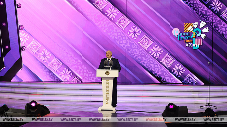 «Эту историю пишете вы — наши любимые артисты, художники, композиторы, поэты, народные мастера. Я от всей души благодарю всех, кто дарит нашему празднику частичку своей души. Мы слышим ее в песнях, видим в театральных постановках, танцевальных номерах и уличных представлениях, в уникальных декоративных изделиях. Мы все, участники, организаторы, гости, создаем здесь удивительную атмосферу истинного, настоящего искусства, которое объединяет народы и государства. Искусства, которое прекрасно своим национальным колоритом, которое является поистине высоким, всегда поднимаясь над политическими играми и интригами», — подчеркнул белорусский лидер.