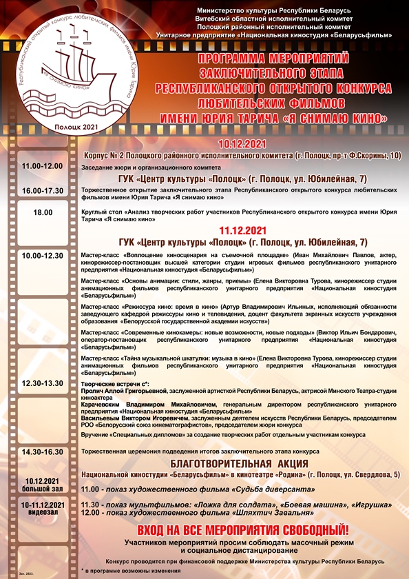 11 декабря с 10.00 до 12.30 в Центре культуры «Полоцк» пройдут мастер-классы. Их проведут Иван Павлов, актер кинорежиссер-постановщик студии игровых фильмов РУП «Национальная киностудия «Беларусьфильм»; Елена Турова, кинорежиссер студии анимационных фильмов РУП «Национальная киностудия «Беларусьфильм»; Артур Ильиных, и.о. заведующего кафедрой режиссуры кино и телевидения, доцент факультета экранных искусств Белорусской государственной академии искусств; Виктор Бондарович, оператор-постановщик РУП «Национальная киностудия «Беларусьфильм».