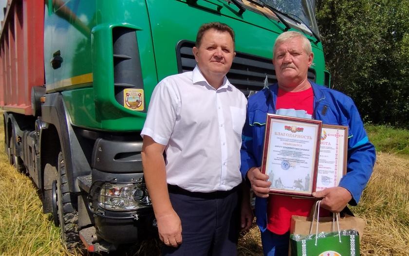 На некалькі хвілін спынілася ўборка каласавых: на поле завіталі старшыня Полацкага райвыканкама Ігар Марковіч, дырэктар гаспадаркі Яўген Набебін, старшыня Полацкага райкама прафсаюза работнікаў АПК Таццяна Акімава. Нагода прыезду — самая што ні ёсць прыемная: вадзіцель філіяла Уладзімір Норат стаў першым у Полацкім раёне перавозчыкам-тысячнікам, які ад камбайнаў на аўтамабілі МАЗ-650128 перавёз больш за тысячу тон зерня.