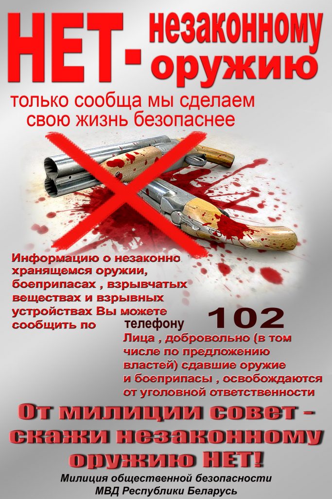 По телефонам «горячей линии» отдела внутренних дел Полоцкого райисполкома 42-32-02, +375295970423 МТС, +375295141182 либо по телефону «102» Вы можете сообщить информацию о незаконно хранящемся оружии, боеприпасах и взрывчатых веществах, а также получить информацию о порядке добровольной сдачи таких предметов».