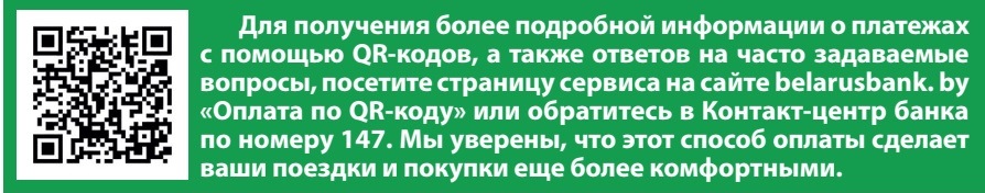 Для получения более подробной информации о платежах с помощью QR-кодов, а также ответов на часто задаваемые вопросы посетите страницу сервиса на сайте belarusbank.by «Оплата по QR-коду» или обратитесь в Контакт-центр банка по номеру 147. А мы уверены, что этот способ оплаты сделает ваши поездки и покупки еще более комфортными.