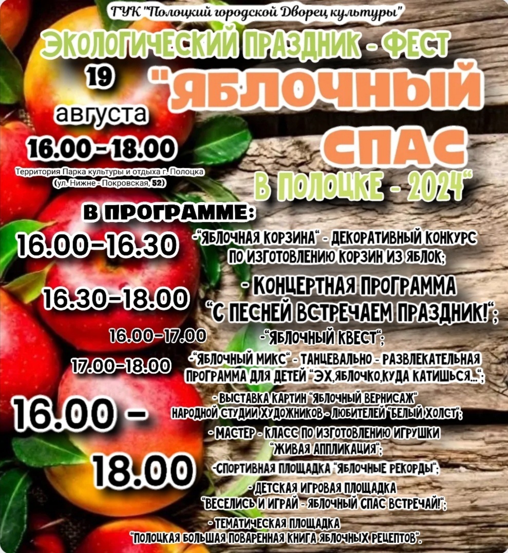 Продолжить чтение19 августа на территории Полоцкого городского парка культуры и отдыха с 16.00 до 18.00 пройдет экологический праздник-фест «Яблочный Спас в Полоцке-2024».