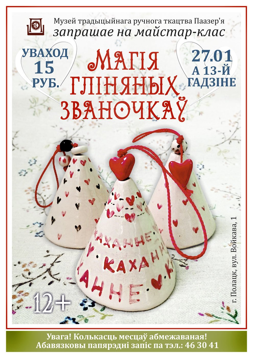 Продолжить чтениеМузей традиционного ручного ткачества Поозерья приглашает всех желающих 27 января в 13.00 на мастер-класс по лепке из глины «Магия глиняных колокольчиков» от полоцкой мастерицы Юлии Ярохнович.