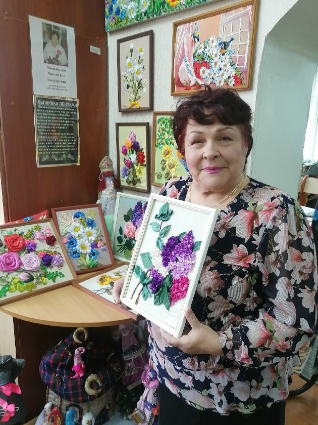 После выхода на пенсию (до этого работала воспитателем в детском саду №9 г.Полоцка) она не хотела сидеть сложа руки. Однажды у своей знакомой увидела картины, вышитые лентами. Они так понравились, что захотелось самой творить такую красоту. Купила книгу по методике вышивки, искала образцы, смотрела мастер-классы в интернете. И получилось!