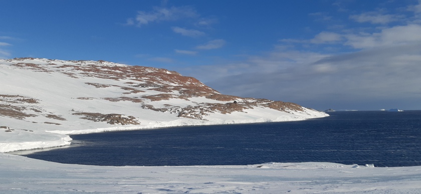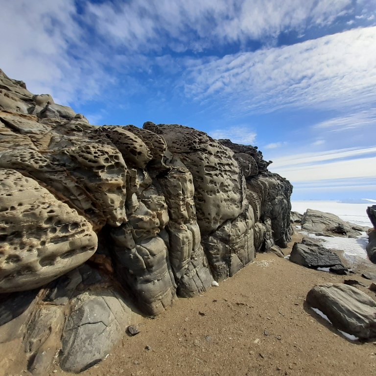 Именно в этот период белый материк перестает быть белым. Здесь можно увидеть выглядывающие из-под снега и льда скалы красного цвета, фантастической формы камни с округлыми углублениями, созданными ветром. Нынче команде повезло: открылось из-подо льда и море.