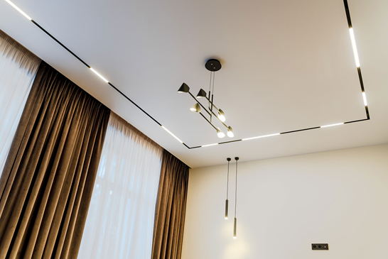 - Профильный карниз встроенного типа: монтируется внутри конструкции натяжного потолка, скрывая механизм полностью.