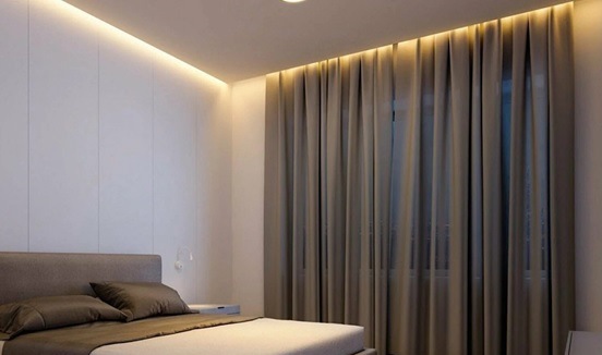 Также важно рассчитать: где будут размещены светильники и подсветка. Скрытый карниз часто сочетают с линейной LED-подсветкой вдоль всей ниши — это акцентный, но мягкий свет, подходящий именно для спальни.