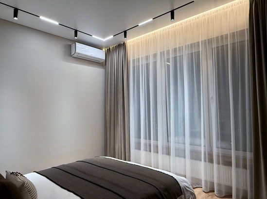 Вывод: сочетание тканевого потолка и скрытого карниза — это идеальное решение для спальни, где важны спокойствие, чистые линии и визуальная лёгкость пространства. Оно не только усиливает расслабляющий эффект, устраняя ненужные детали, но и повышает практичность интерьера благодаря матовой текстуре и незаметной интеграции штор.