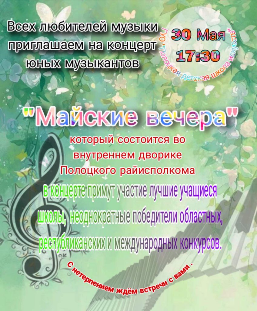 Полоцкая детская школа искусств приглашает всех любителей музыки на «Майские вечера», где можно будет насладиться чарующими мелодиями, отключиться от городского шума и суеты и получить заряд положительных эмоций.