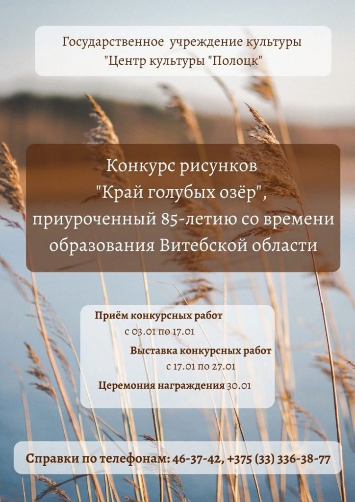 Центр культуры «Полоцк» приглашает жителей Полоцкого района принять участие в конкурсе рисунков «Край голубых озёр», приуроченном к 85-летию образования Витебской области.