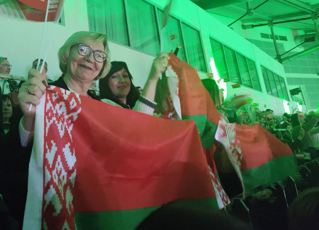 Сейчас на сцене «Минск-Арена» проходит интерактив. Белорусы вместе поют, танцует, отгадывают белорусские хиты.