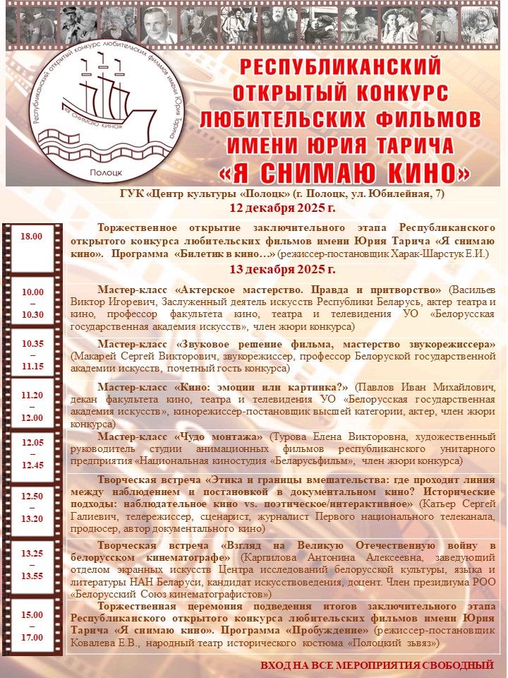 Полоцк на несколько дней станет центром притяжения любителей киноискусства. 12-13 декабря пройдет XII Республиканский открытый конкурс любительских фильмов имени Юрия Тарича «Я снимаю кино».