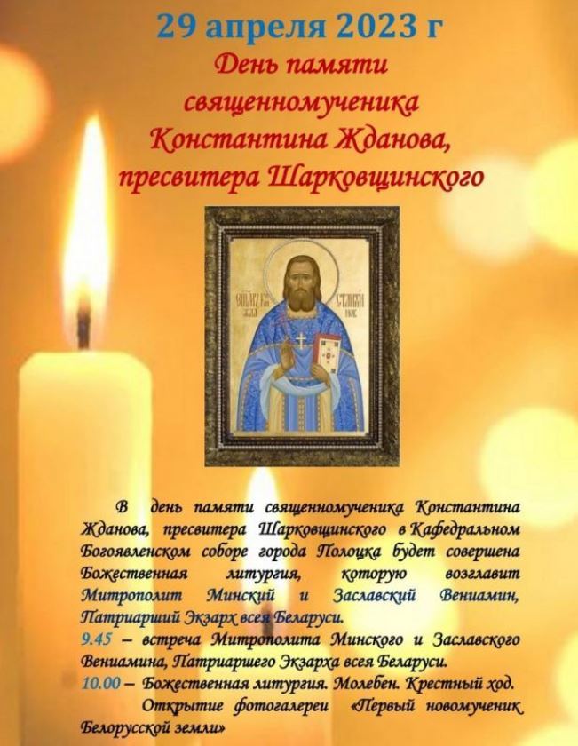 29 апреля, в День мученической кончины священномученика Константина Жданова, пресвитера Шарковщинского, в Богоявленском кафедральном соборе состоится Божественная литургия. Богослужение возглавит Митрополит Минский и Заславский Вениамин, Патриарший Экзарх всея Беларуси.