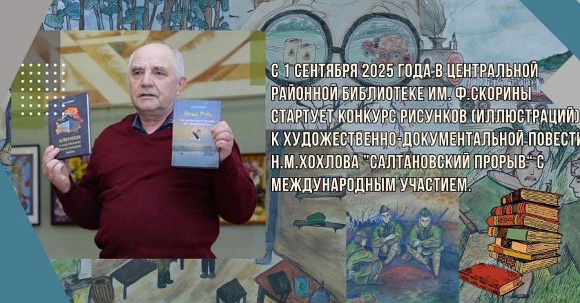 С 1 сентября 2025 года в Центральной районной библиотеке имени Франциска Скорины стартует третий конкурс рисунков (иллюстраций) к художественно-документальной повести Николая Михайловича Хохлова «Салтановский прорыв» с международным участием.