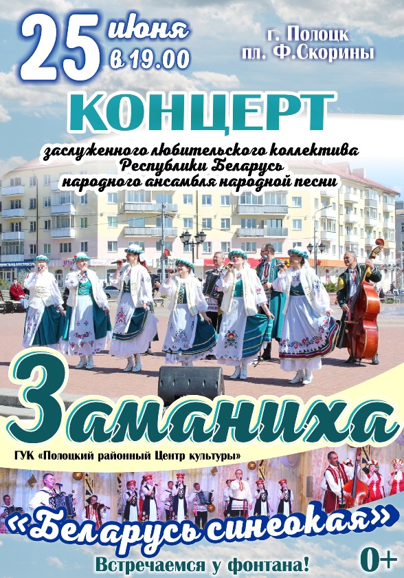 25 июня в 19.00 на площади Франциска Скорины для вас самые лучшие песни из своего репертуара исполнит заслуженный любительский коллектив Республики Беларусь народный ансамбль народной песни «Заманиха» (руководитель Сергей Смулько).