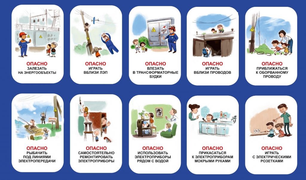 — НЕЛЬЗЯ залезать на опоры ЛЭП, играть рядом с трансформаторными будками, открывать их двери и проникать внутрь.