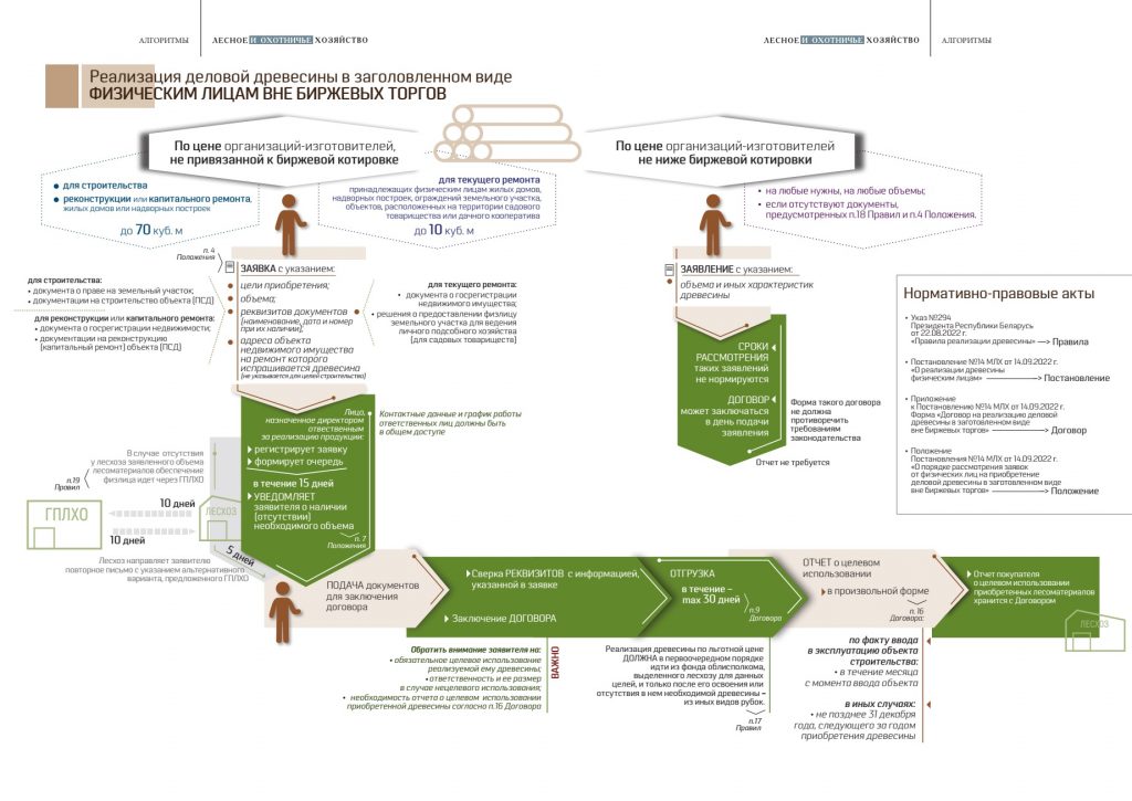 Древесина в заготовленном виде вне биржевых торгов реализуется на основании Правил реализации древесины, утвержденных Указом Президента Республики Беларусь от 22 августа 2022 года № 294, и требований постановления Министерства лесного хозяйства Республики Беларусь от 14 сентября 2022 года № 14.