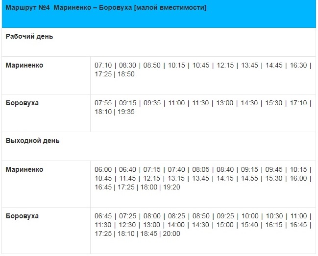 В связи с неукомплектованностью штата водителей и невозможностью выполнения регулярных рейсов, выполняемых автобусами малой вместимости, по маршруту №4 «Мариненко – Боровуха», с 1 февраля 2026 года данные рейсы переводятся в дополнительные, отправлением с конечных остановок: