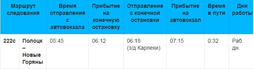 С 1 июля по рабочим дням изменяется расписание движения по пригородному маршруту 222 с Полоцк – Новые Горяны.