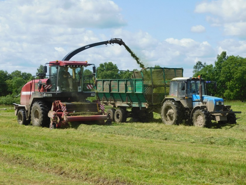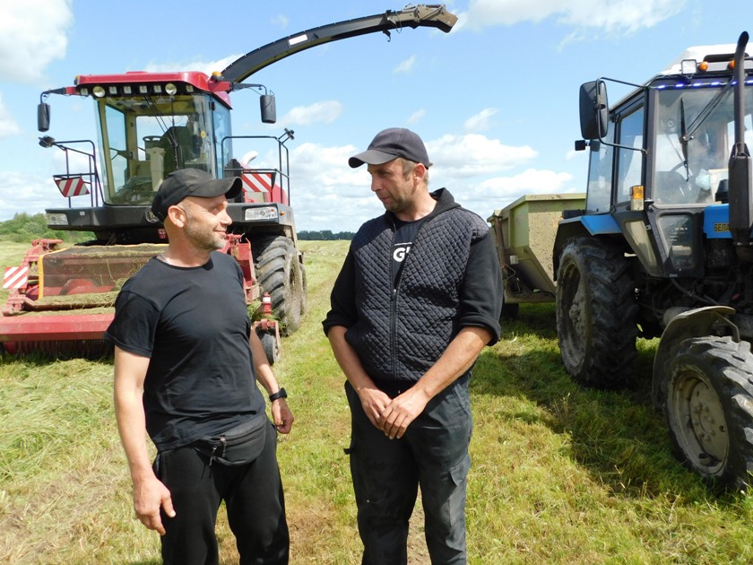 Сяргей Шалуха працаваў на кормаўборачным камбайне, яго напарнік — на трактары. На думку вопытнага земляроба Сяргея Шалухі, сёлета травастой добры, па фазе травы падыйшлі да кашэння, праблема толькі ў тым, што цяжкія МАЗы, на якіх звычайна перавозіўся сянаж да траншэі, пасля дажджу на поле заехаць не могуць.