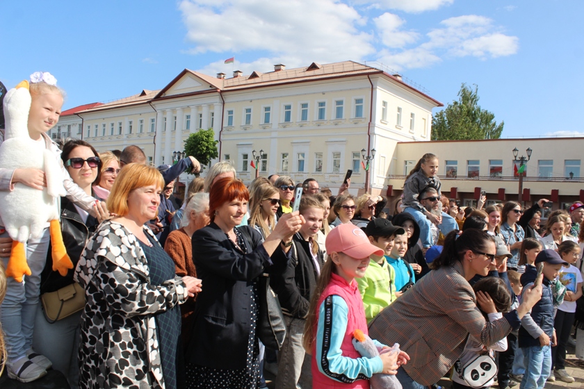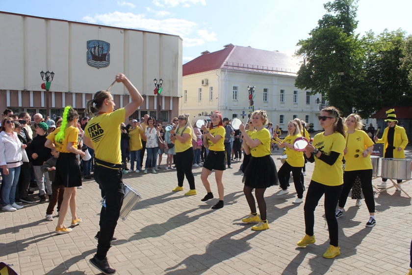Во второй половине дня площадь Свободы превратилась в огромный спортзал. Здесь в День города свое мастерство демонстрировали белорусские силачи и спортсмены, а еще сюда заглянули и барабанщики в ярко желтых футболках – шоу Baraband.