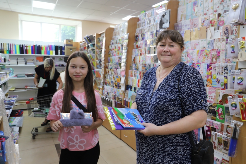 Покупателей много, среди них Татьяна Лышко с дочерью Дарьей. Они приехали из д.Фариново, чтобы закупить канцелярские принадлежности.