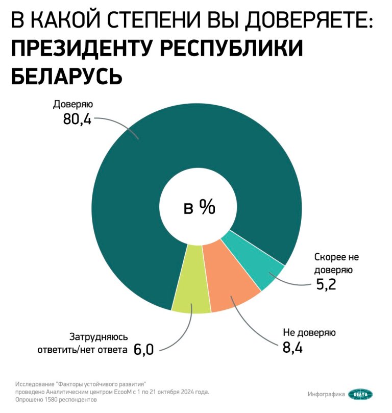 Респондентам предлагалось ответить на вопрос «В какой степени вы доверяете Президенту Республики Беларусь?». В итоге «доверяю» ответили 80,4% опрошенных, «скорее не доверяю / не доверяю» — 13,6%, «затрудняюсь ответить / нет ответа» — 6% респондентов.