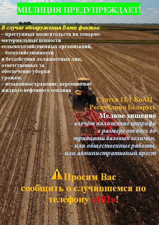 Если вы располагаете информацией о фактах хищения товарно-материальных ценностей с объектов агропромышленного комплекса, нарушениях трудовой дисциплины, нахождении сторожей на рабочем месте в рабочее время в состоянии алкогольного опьянения убедительно просим незамедлительно сообщать в оперативно-дежурную службу Полоцкого РОВД по телефонам (анонимность гарантируем): 102; 46-32-02.