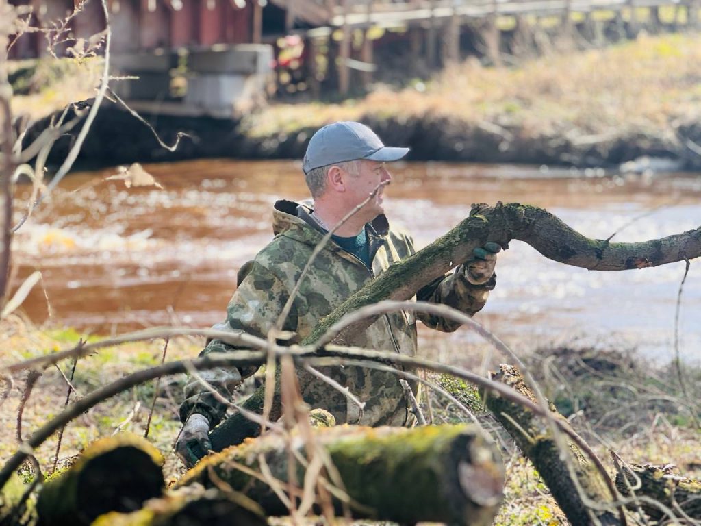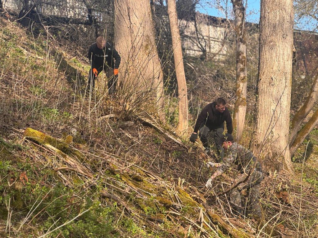 Ребята наводили порядок на склоне вдоль временного пешеходного моста через р.Полоту по ул.Октябрьской. Спасатели убирали сухую растительность, засохшие деревья.