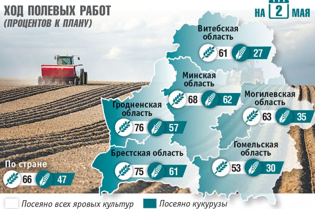 Больше всего посеяно в Гродненской области — 76 процентов (год назад — 68). В Брестской — 75 (67), Минской — 68 (51), Могилевской — 63 (47), Витебской — 61 (36), Гомельской — 53 (39). Как видим, наибольший прогресс по сравнению с прошлым годом достигнут в Витебской области. В комитете по сельскому хозяйству и продовольствию облисполкома северного региона сообщили, что это стало следствием лучшей организации труда и более благоприятных погодных условий, чем в 2024‑м.