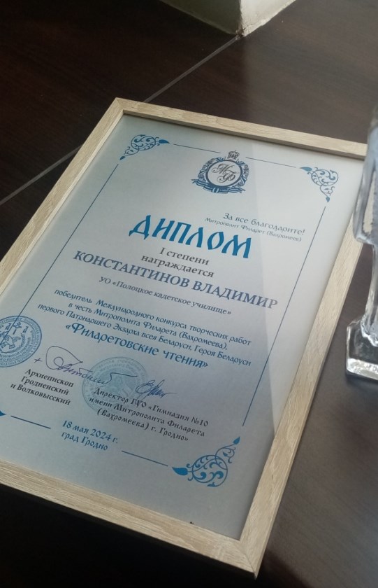 По итогу «Филаретовских чтений» Владимир за исследовательскую работу «Вклад митрополита Филарета (Вахромеева) в возрождение и восстановление христианских святынь Полоцкой епархии» был удостоен Диплома I степени.