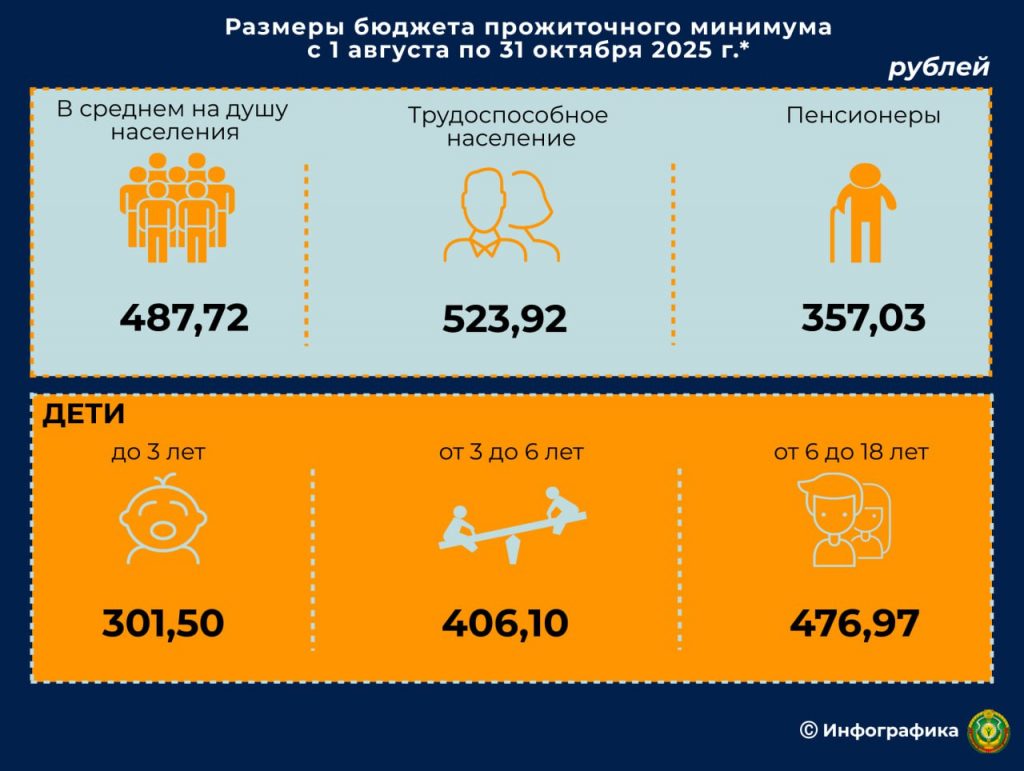Постановлением Министерства труда и социальной защиты с 1 августа по 31 октября нынешнего года утверждены размеры бюджета прожиточного минимума в среднем на душу населения и по основным социально-демографическим группам, сообщает телеграм-канал Минтруда.