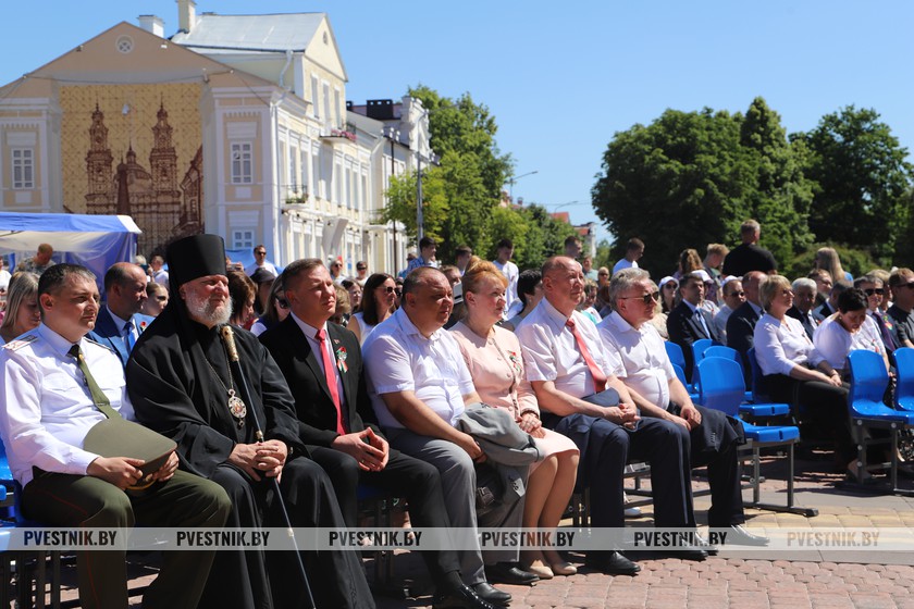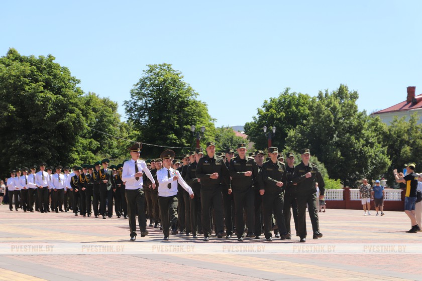 Зрелищным и воодушевляющим моментом праздника стало торжественное прохождение войсковых частей и подразделений Полоцкого гарнизона по площади Свободы под звуки марша в исполнении военно-духового оркестра.