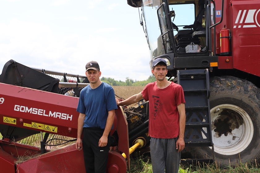 На поле работали два комбайна. Механизаторы Владимир Глебко и Вячеслав Леньшин — люди опытные, оба уже более десятка лет за штурвалом.