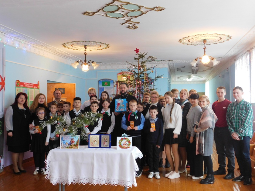 Участникам рождественской встречи Божье слово произнес настоятель храма Георгия Победоносца иерей Михаил Талерёнок. Он совершил своеобразный экскурс в историю праздника. Что особенного сделал Бог? Для чего мы живем на земле? В чем счастье? Эти и многие другие вопросы он разъяснил школьникам и педагогам. Вспомнил известную фразу, сказанную героем одного из романов Ф.М.Достоевского, что «красота спасет мир». «Но какой смысл автор вкладывал в понятие «красота»? — обратился он к присутствующим. — Красоту души, которая спасет мир. Бог и призывает к красоте души. К любви. К благим делам».
