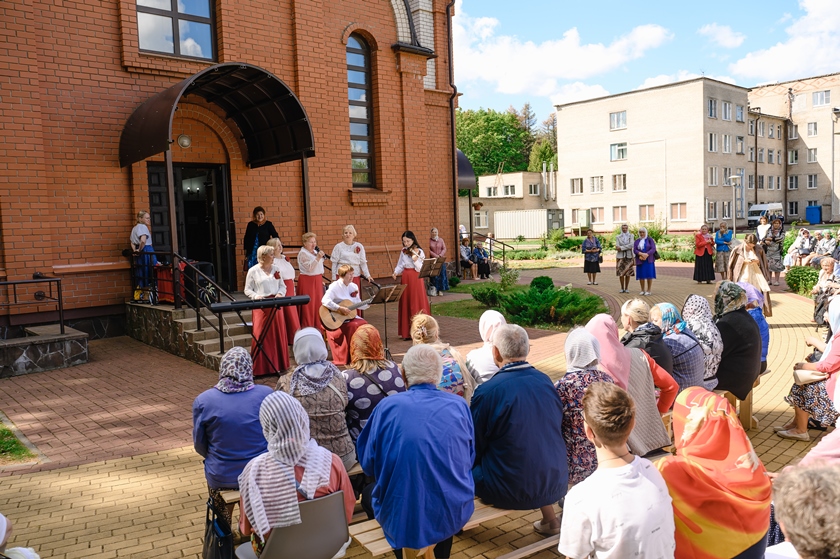 Но мероприятие на этом не закончилось, а продолжилось на территории храма. Для многочисленных гостей организовали трапезу, где они смогли отведать пироги, фрукты и даже полакомиться настоящей полевой кашей — это стало возможным благодаря стараниям в/ч 5530. Детей ожидало развлечение от агентства детских праздников «Радуга». Девчонки и мальчишки играли, веселись, соревновались в умениях и ловкости, ловили мыльные пузыри, а на их лицах красовался цветной аквагрим. В свою очередь взрослые могли насладиться музыкальными композициями в исполнении народного камерного духовно-патриотического ансамбля «Спадчына» Полоцкого районного Центра ремесел и национальных культур.