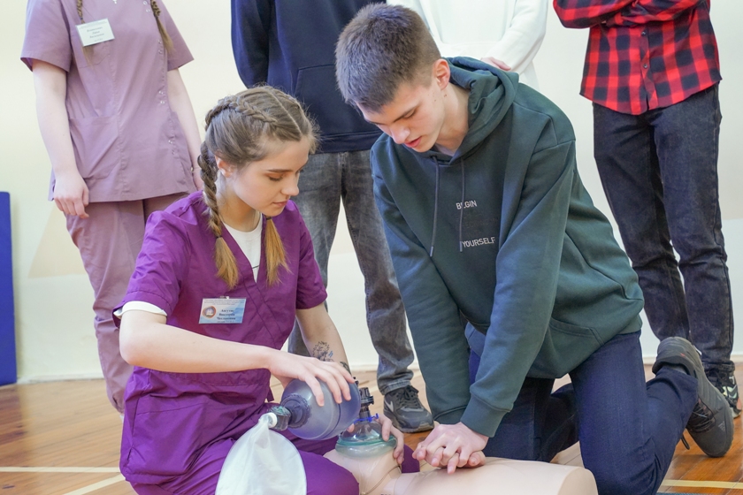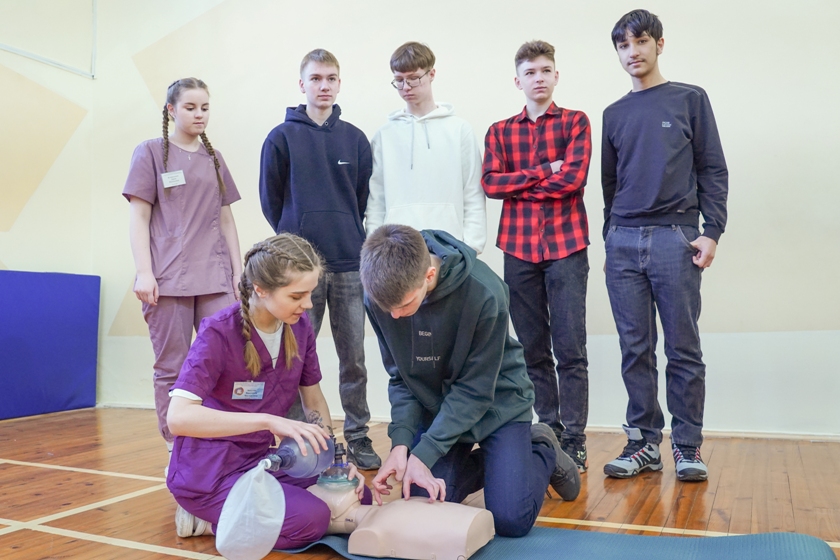 Во время теоретической части мероприятия гимназисты рассмотрели принципы оказания первой помощи, наиболее актуальные вопросы проведения базовой сердечно-легочной реанимации в соответствие с современными протоколами.
