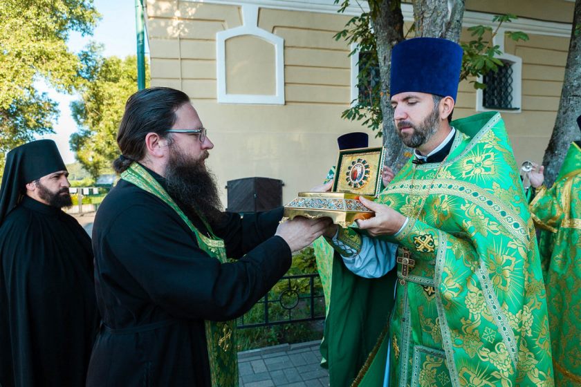 У стен Богоявленского кафедрального собора святыню встретили секретарь Полоцкой епархии протоиерей Александр Петлицкий вместе с духовенством.
