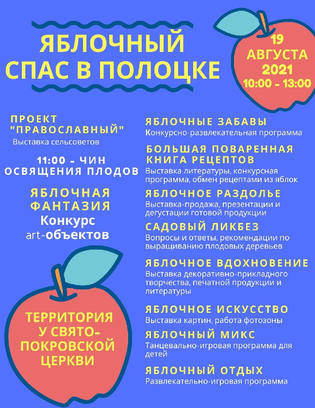 Для вас — работа тематических площадок, на которых будут представлены проекты «Православный», «Яблочные забавы», «Полоцкая большая поваренная книга яблочных рецептов», «Яблочное раздолье». Также состоится полюбившийся полочанам конкурс арт-объектов «Яблочная фантазия», тематику которого определяет Год народного единства.