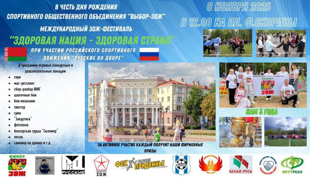 8 ноября с 12.00 до 16.00 на площади Франциска Скорины состоится первый международный ЗОЖ-фестиваль «Здоровая нация — здоровая страна».