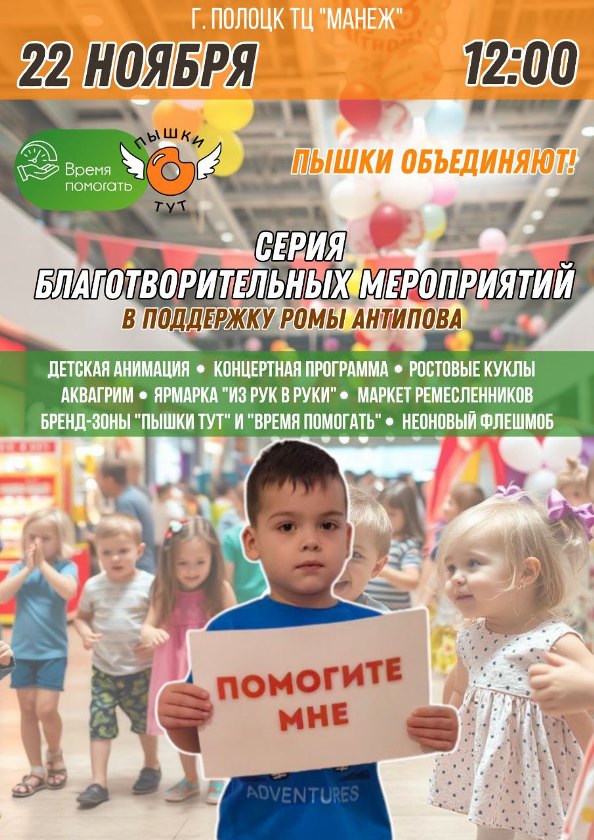 В Полоцке пройдет добрая инициатива. 22 ноября в 12.00 в ТЦ «Манеж» стартует серия благотворительных мероприятий в поддержку Ромы Антипова.