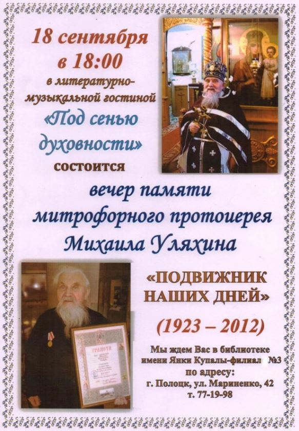 18 сентября в 18:00 на базе библиотеки имени Янки Купалы-филиала №3 в рамках литературно-музыкальной гостиной состоится вечер памяти митрофорного протоиерея Михаила Уляхина.