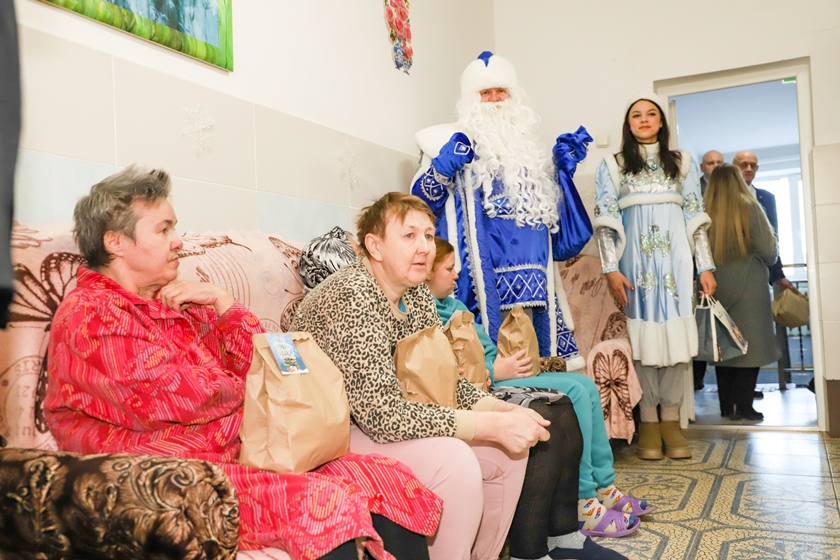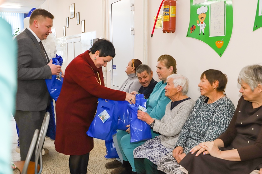 В ГУ «Полоцкий социальный пансионат «Софийский» вместе с главными новогодними персонажами – Дедом Морозом и Снегурочкой – приехали председатель Полоцкого райисполкома Василий Шилов, председатель Солоникского сельисполкома Максим Кирпиченок, начальник управления по труду, занятости и социальной защите райисполкома Светлана Касьянова, директор филиала «Полоцкий хлебозавод» Андрей Мерзлов, директор УП «Полоцкий рынок» Диана Кузикова, заместитель директора филиала «Полоцкводоканал» Сергей Некрасов.