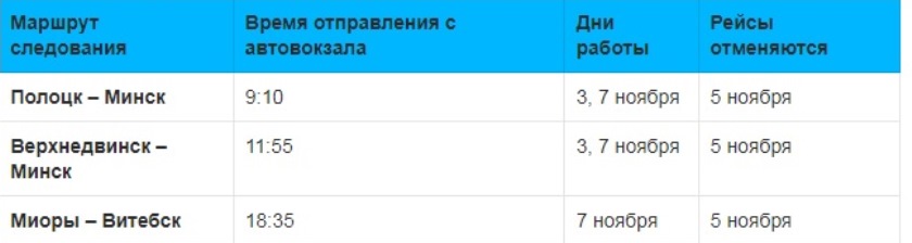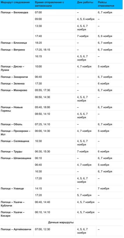 С 04.11.2023 по 07.11.2023 автобусы филиала «Автобусный парк №2 г.Полоцка» на пригородных и междугородных маршрутах будут выполнять рейсы по расписанию согласно дням недели со следующими изменениями: