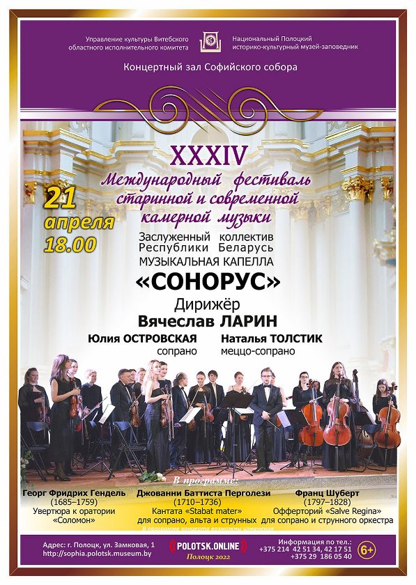 В рамках XXХIV Международный фестиваль старинной и современной камерной музыки, 21 апреля в 18.00 состоится концерт Заслуженный коллектив Республики Беларусь «Музыкальная капелла «СОНОРУС».