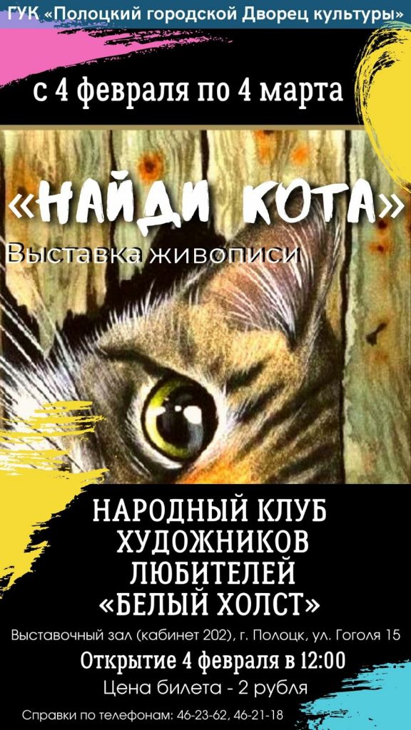 Выставка живописи «Найди кота» будет работать до 4 марта в выставочном зале Полоцкого ГДК (каб.202).