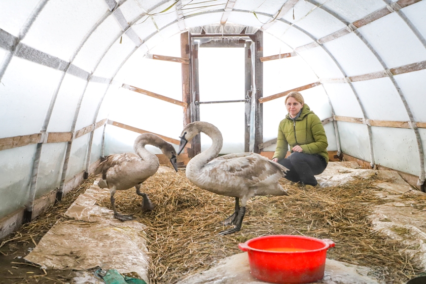 Потом появились молодые (еще серого окраса) лебеди. За первым, найденным работниками завода стекловолокна, Виталий и Людмила приехали 1 января, а 5 января им предложили взять еще одного. О птице, целый день пролежавшей на морозе возле дороги недалеко от аг.Горяны, в инспекцию сообщил проезжавший мимо мужчина. Оба лебедя не имели внешних повреждений, но были сильно истощены. К сожалению, вторую птицу спасти не удалось. Через неделю Авакянам снова позвонили с предложением — взять лебедя из д.Фариново. Домом для птиц временно стала теплица.
